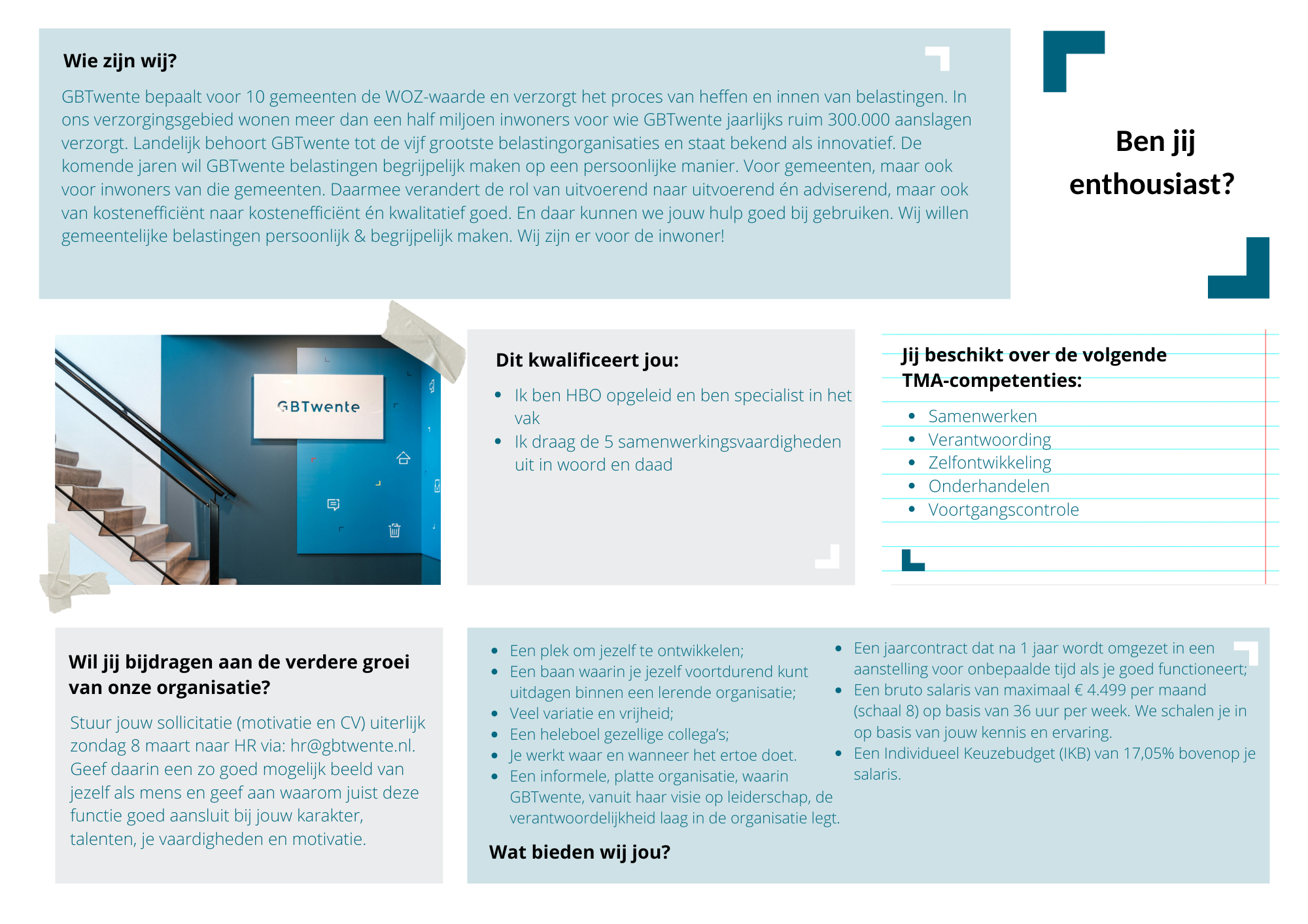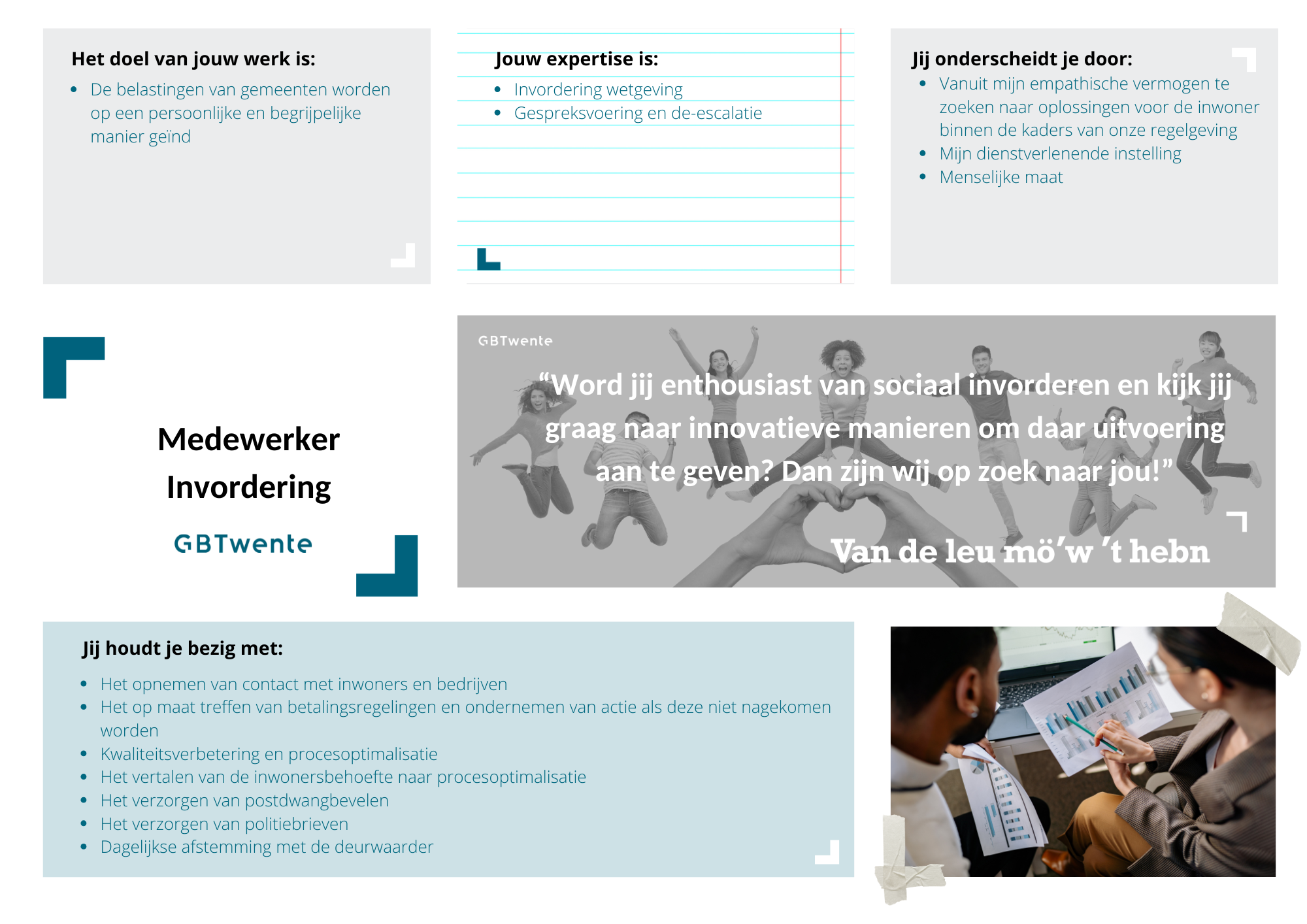 We zoeken iemand die uiteraard enthousiast wordt van sociaal invorderen. Je bent ondernemend en creatief en gebruikt dit om het bestaande proces te finetunen. Daarnaast stá je voor wat jij en je collega’s hebben gedaan. Tot slot weet je met jouw aanstekelijke enthousiasme en opvallende manier van doen je collega’s mee te krijgen als je iets voor elkaar wil krijgen.
